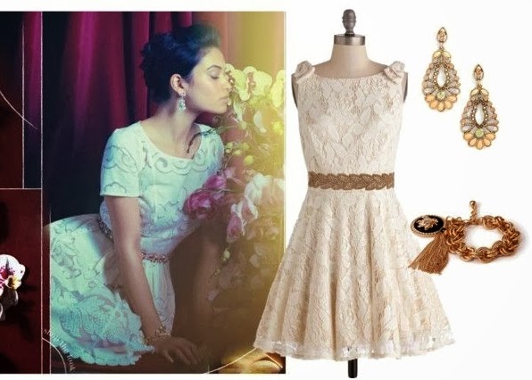 Look 3: Anthropologie’s Ivorie Dress ($188), Sparkled Leis Belt ($58), Chibae Earrings ($38), AnglaiseBracelet ($48)
